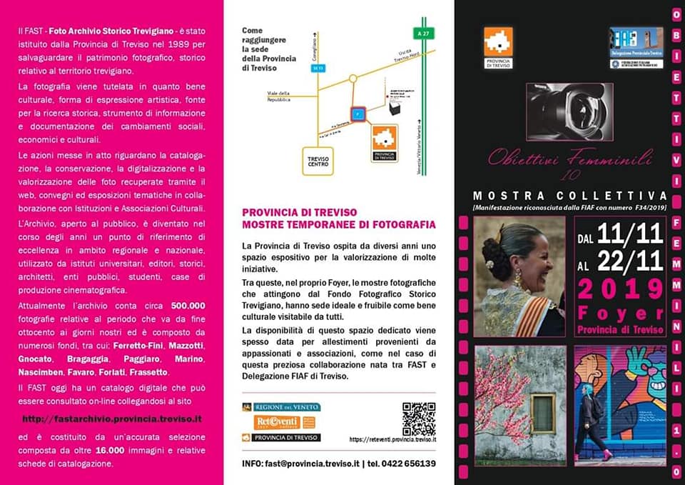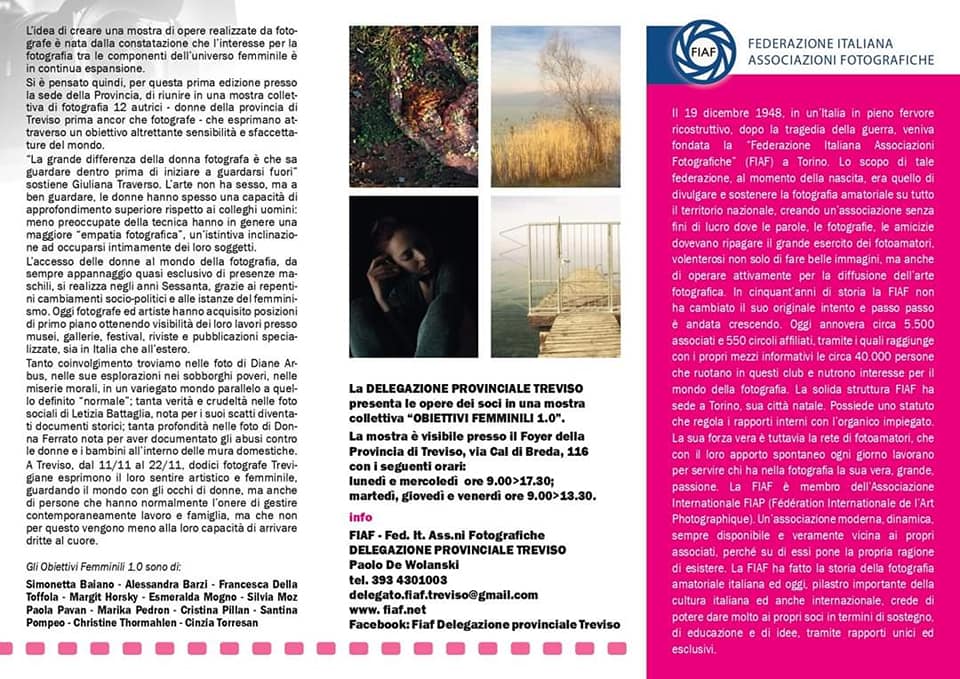 La mostra, intitolata “Obiettivi femminili” ha utilizzato lo spazio espositivo presente nell’edificio centrale della Provincia di Treviso. E’ stata realizzata con il patrocinio della Fiaf, in quanto il FotoClubCasier è associato alla Federazione. Hanno partecipato due iscritte.