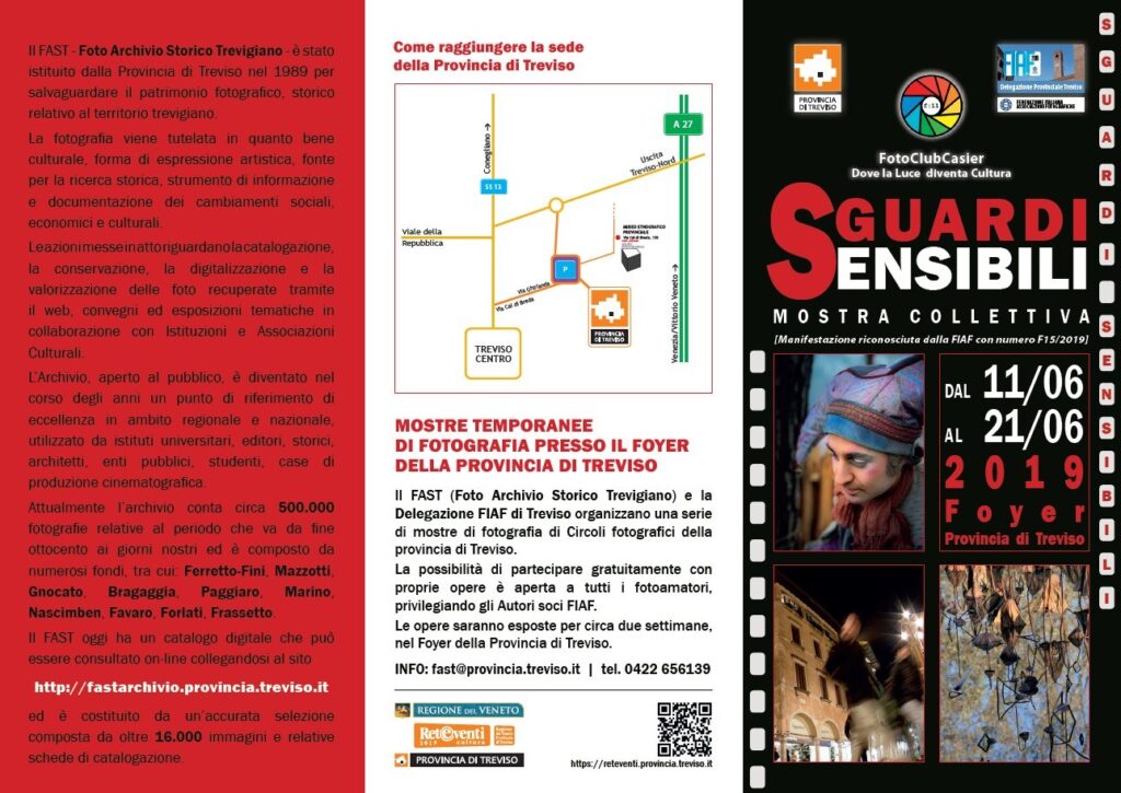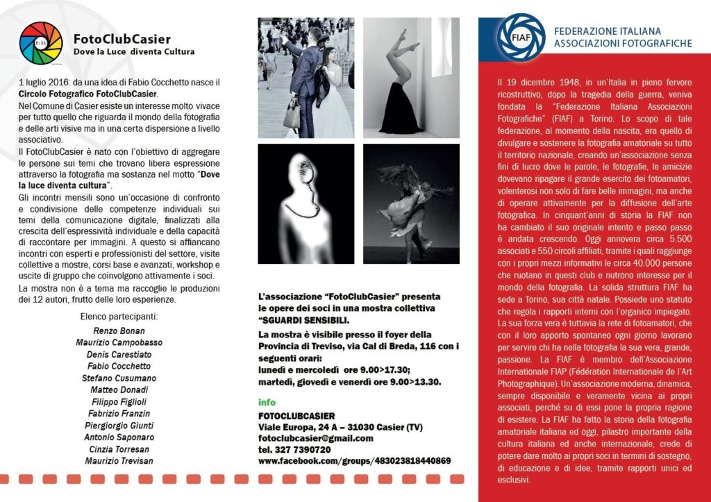 La mostra, intitolata “Sguardi Sensibili” ha utilizzato lo spazio espositivo presente nell’edificio centrale della Provincia di Treviso. E’ stata realizzata con il patrocinio della Fiaf, in quanto il FotoClubCasier è associato alla Federazione.